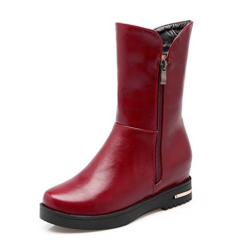 AllhqFashion Women's Solid PU Kitten-Heels Zipper Round Closed Toe Boots, Claret, 42