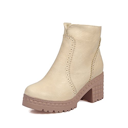 AmoonyFashion Women's Round Closed Toe Low Top High-Heels Solid PU Boots, Beige, 38
