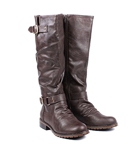 Hot Fashion Buckle Zip Open Faux Leather Womens Knee-high Boots Low Heels Shoes New Without Box (6.5, Brown)