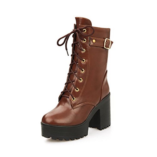 VogueZone009 Womens Closed Round Toe High Heel Short Plush Solid Boots with Buckle and Bandage, Brown,7.5 B(M) US