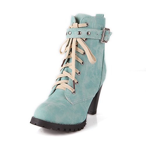 WeiPoot Womens Closed Round Toe High Heels PU Soft Material Solid Boots with Chunky Heels and Bandage, Blue, 10 B(M) US